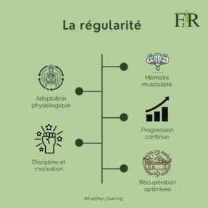 En résumé, la régularité est essentielle car elle permet à ton corps de s’adapter progressivement, d’améliorer ses performances, et de réduire les risques de blessures, tout en renforçant ta motivation et ta discipline.